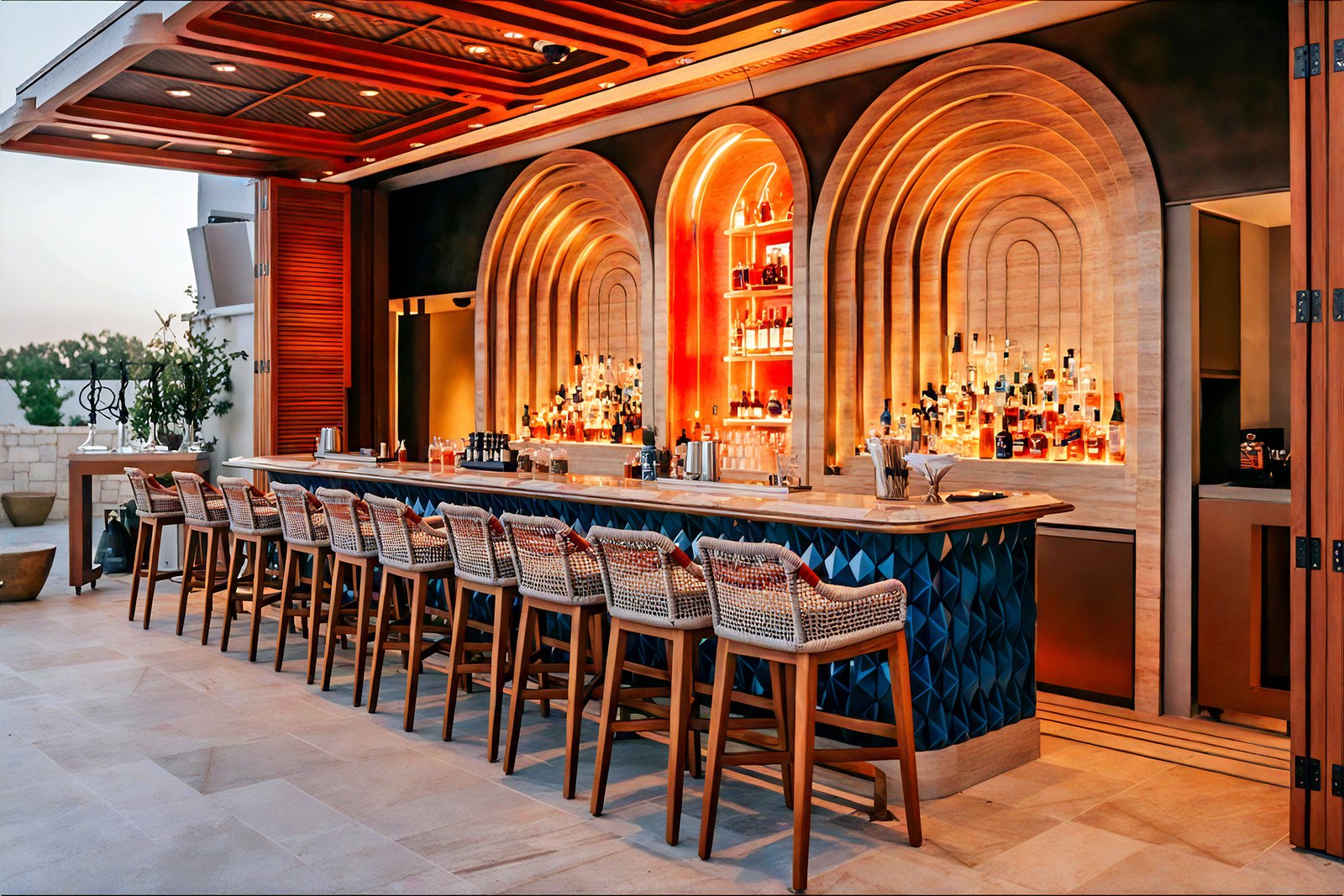 Westar Architects International created the stunning Anaïs Bar, a vibrant destination at City of Dreams Mediterranean. Bold arches, warm lighting, and layered textures define its bespoke Mediterranean poolside bar.