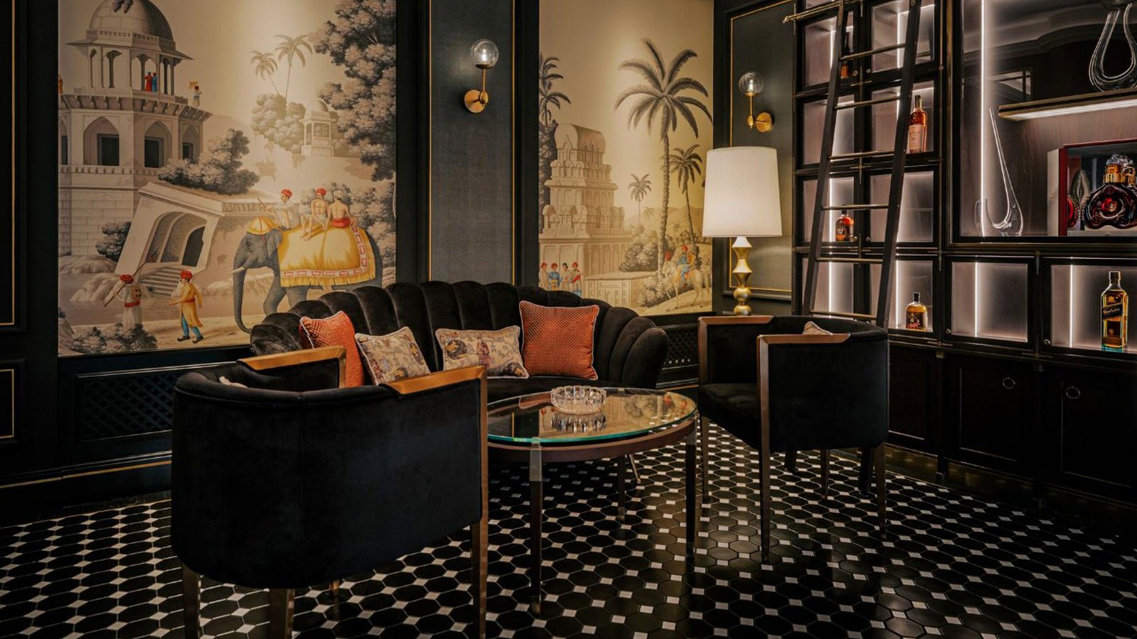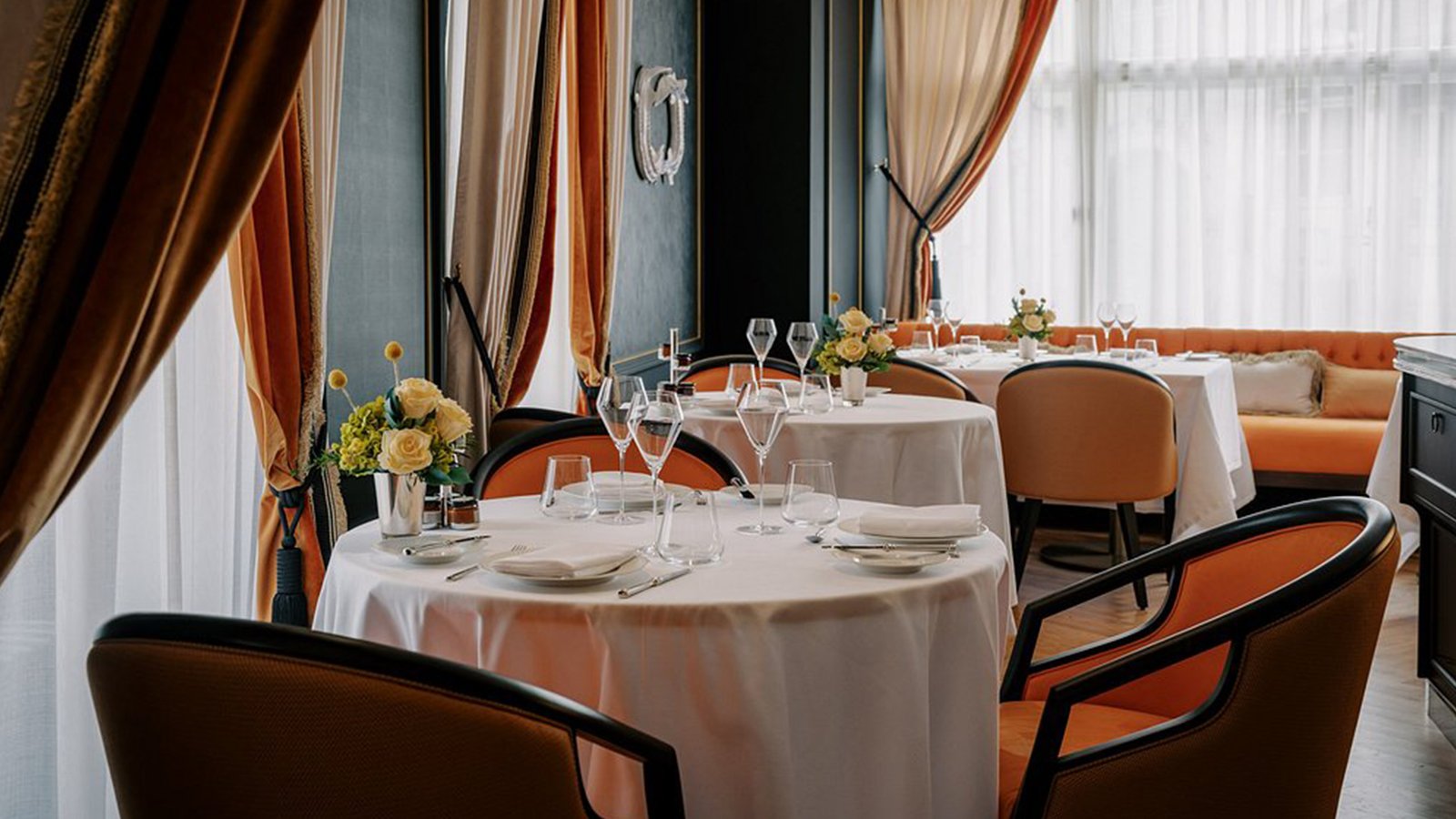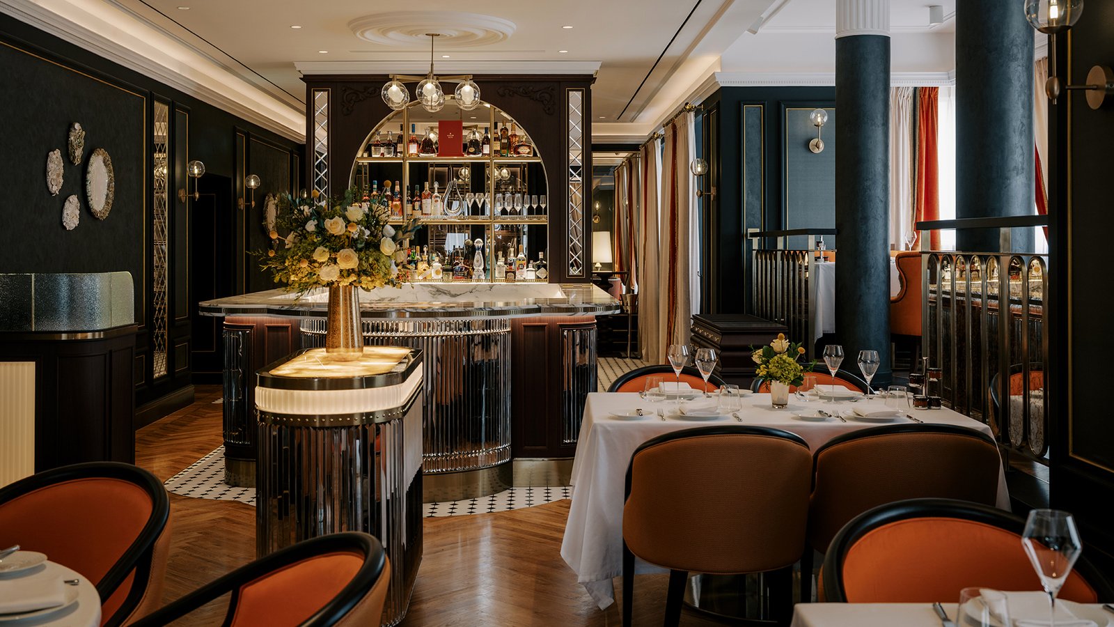 Timeless elegance and contemporary flair are achieved through a combination of historical architectural elements and thoughtful symmetry, particularly the pre-existing classical columns, framing the dining and bar areas and evoking a sense of permanence.