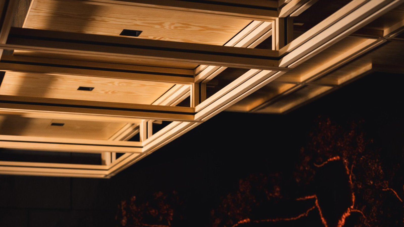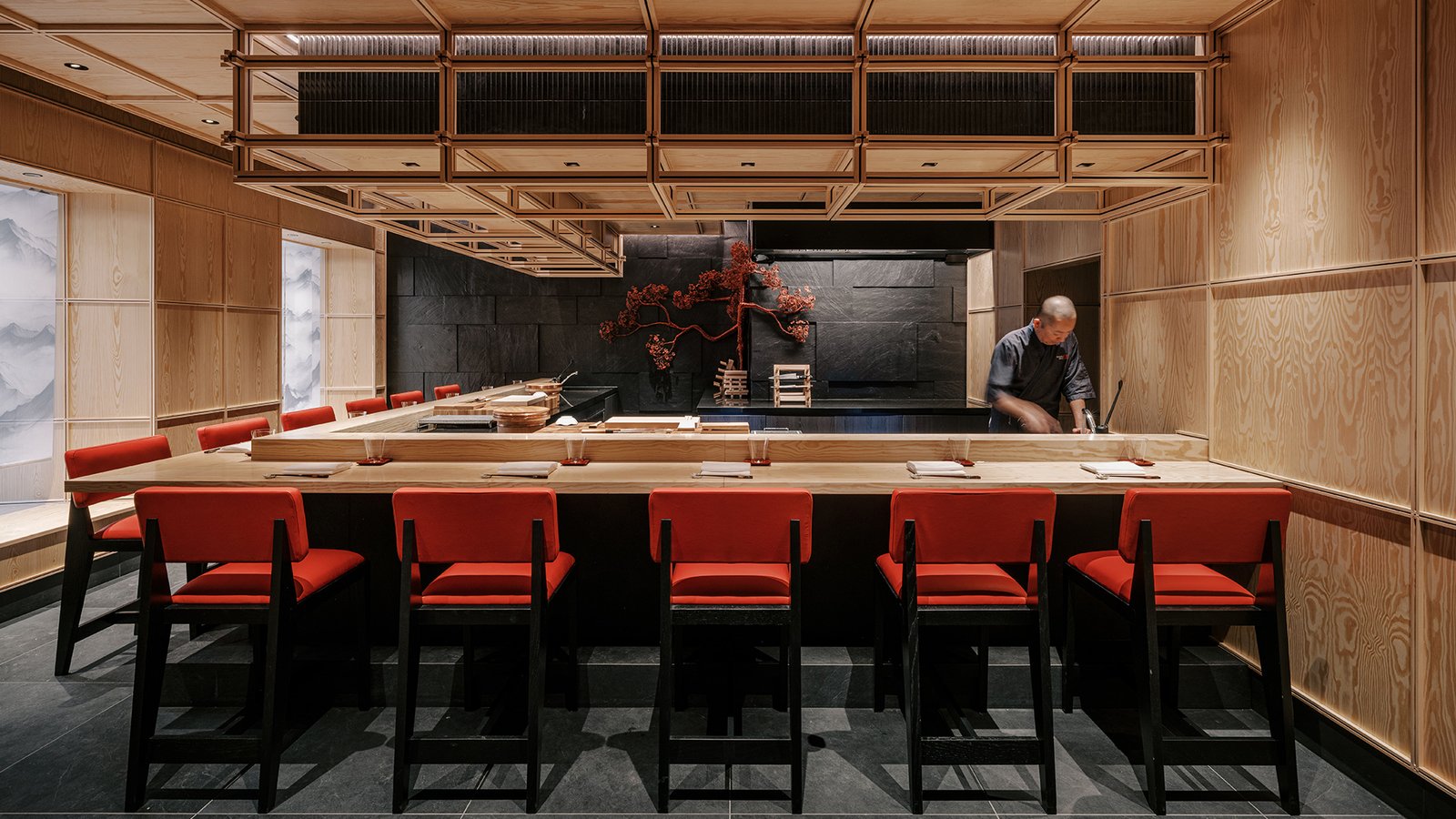 Koyo celebrates the art of omakase cuisine in an intimate atmosphere, offering each guest an exclusive dining experience. Inspired by classic Japanese architectural references, the intricate wood veneer paneling and the large gate pay homage to the rich ancestry of traditional Japanese worship temples. The indirect light washes over darker finishes along the walls, setting a dramatic mood for an unique culinary journey.